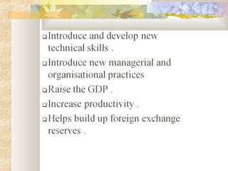 A multinational corporation (MNC) is a company that owns or controls production of services in more than one country. MNCs originated in the early 20th century and expanded after World War II. They manage production facilities across borders to produce similar products (horizontally integrated), as inputs for other facilities (vertically integrated), or diversified products. MNCs establish foreign operations to increase markets, lower costs, and access resources, though they can also face government restrictions or pressure local businesses. Both home and host countries typically benefit from technology sharing, investment, and trade.