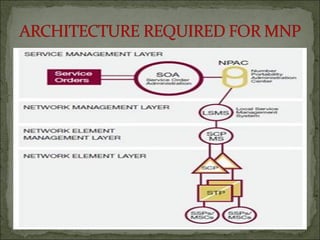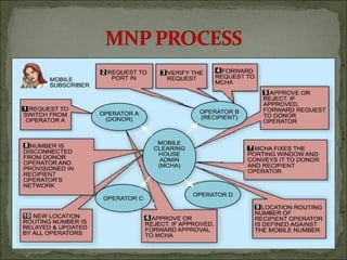 This document discusses Mobile Number Portability (MNP) in India. It defines MNP as the ability for subscribers to retain their mobile number when changing service providers. The key features of MNP are service provider portability, location portability, and service portability. The document outlines the porting process, technical implementation using location routing numbers, and advantages for both subscribers and operators in a competitive mobile market.