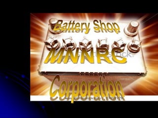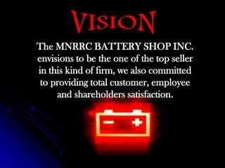 The document outlines the vision, mission, and goals of MNRRC Battery Shop Inc. The vision is to be a top seller of batteries and provide total satisfaction to customers, employees, and shareholders. The mission is to satisfy customers with high quality, on-time batteries at competitive prices while focusing on environmental friendliness. The goals are to satisfy customer battery needs, engage in battery trading, and provide warranties.