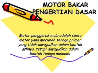 Motor bakar adalah motor penggerak mula yang mengubah energi kimia bahan bakar menjadi panas melalui pembakaran, kemudian panas tersebut diubah menjadi energi mekanik."