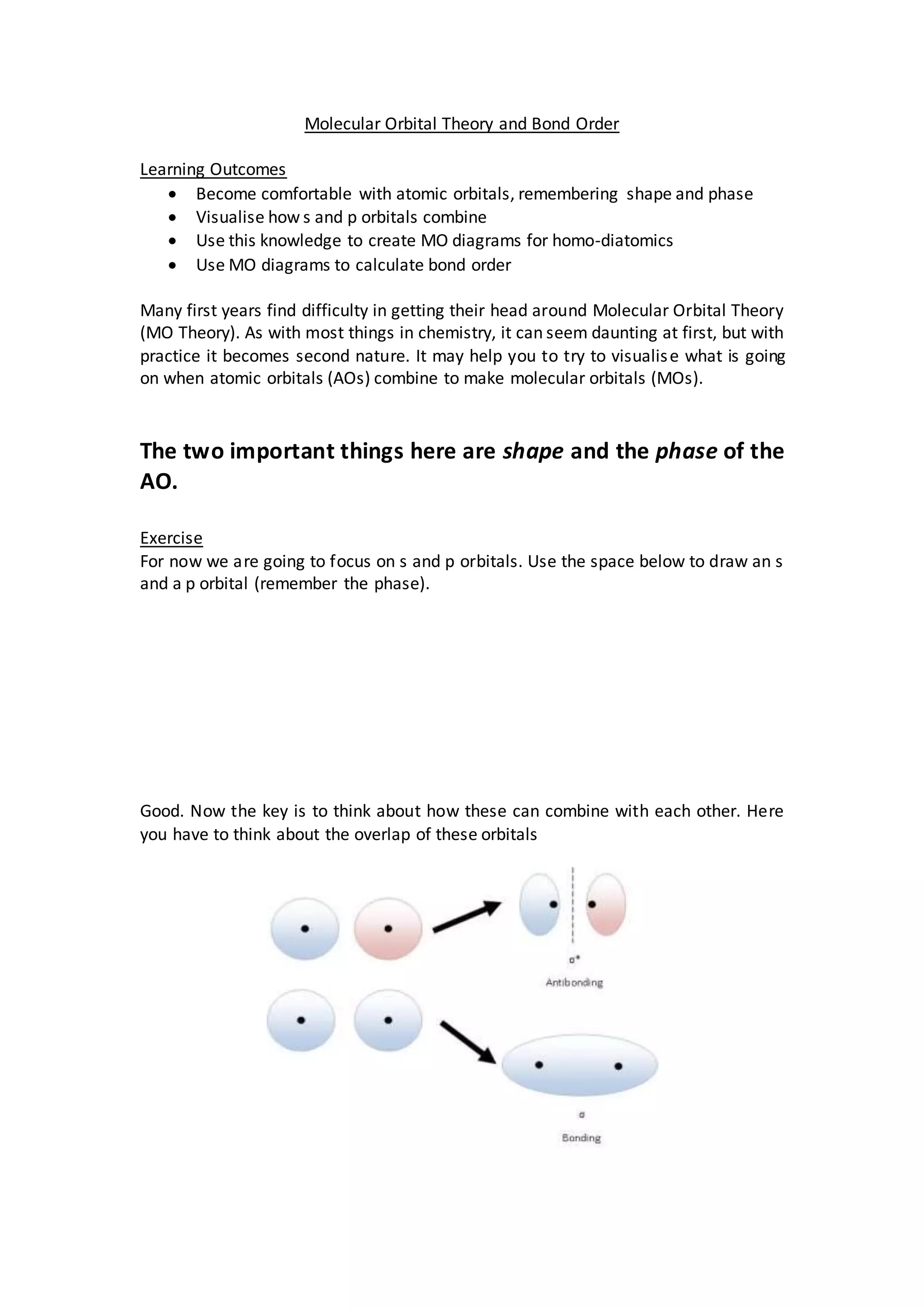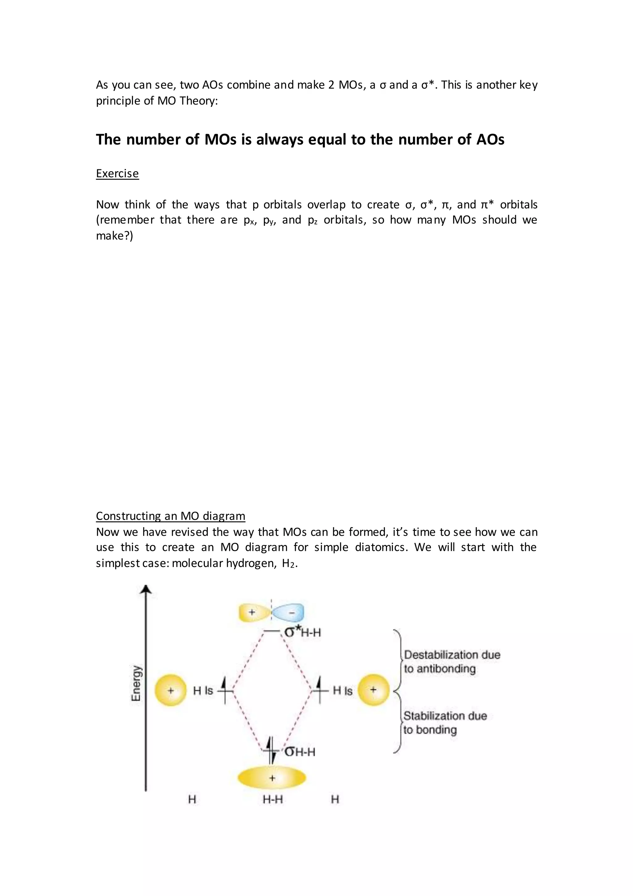 This document discusses molecular orbital theory and how it can be used to calculate bond order in diatomic molecules. It explains that atomic orbitals combine to form molecular orbitals, with the number of molecular orbitals always equal to the number of atomic orbitals. The key types of molecular orbitals - sigma, sigma star, pi, and pi star - are formed from the overlap of s and p orbitals. As an example, it shows the molecular orbital diagram for H2, where the 1s atomic orbitals form a bonding and antibonding sigma molecular orbital. The bond order is calculated to be 1.