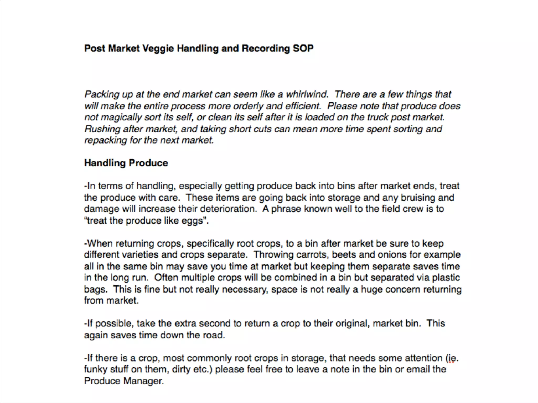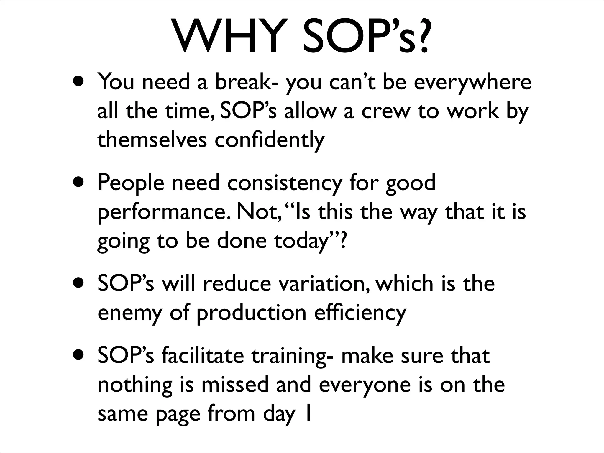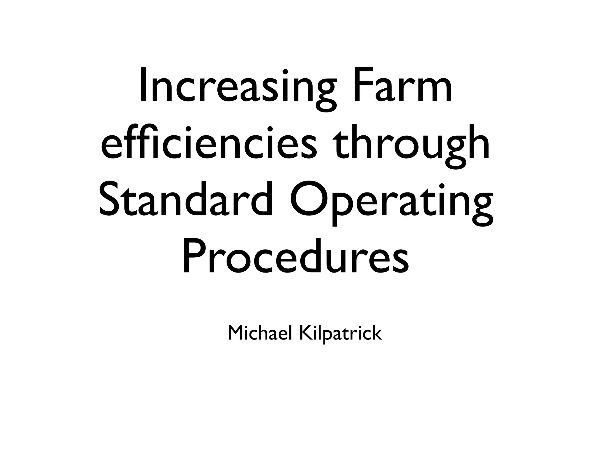 The document outlines the importance of standard operating procedures (SOPs) in farming to enhance efficiency, consistency, and safety among employees. It details steps for developing effective SOPs, including naming them, defining their scope, and involving staff in their creation to ensure buy-in and compliance. Additionally, it emphasizes the necessity of training and the need for routine monitoring and updates to these procedures for continuous improvement.