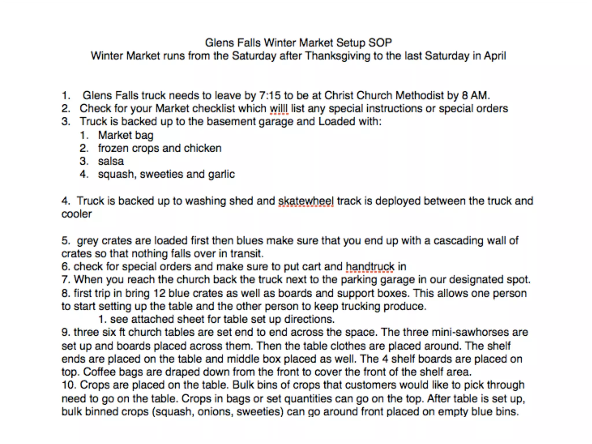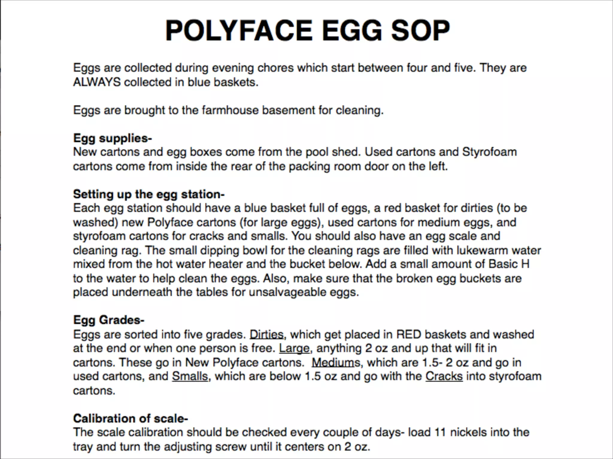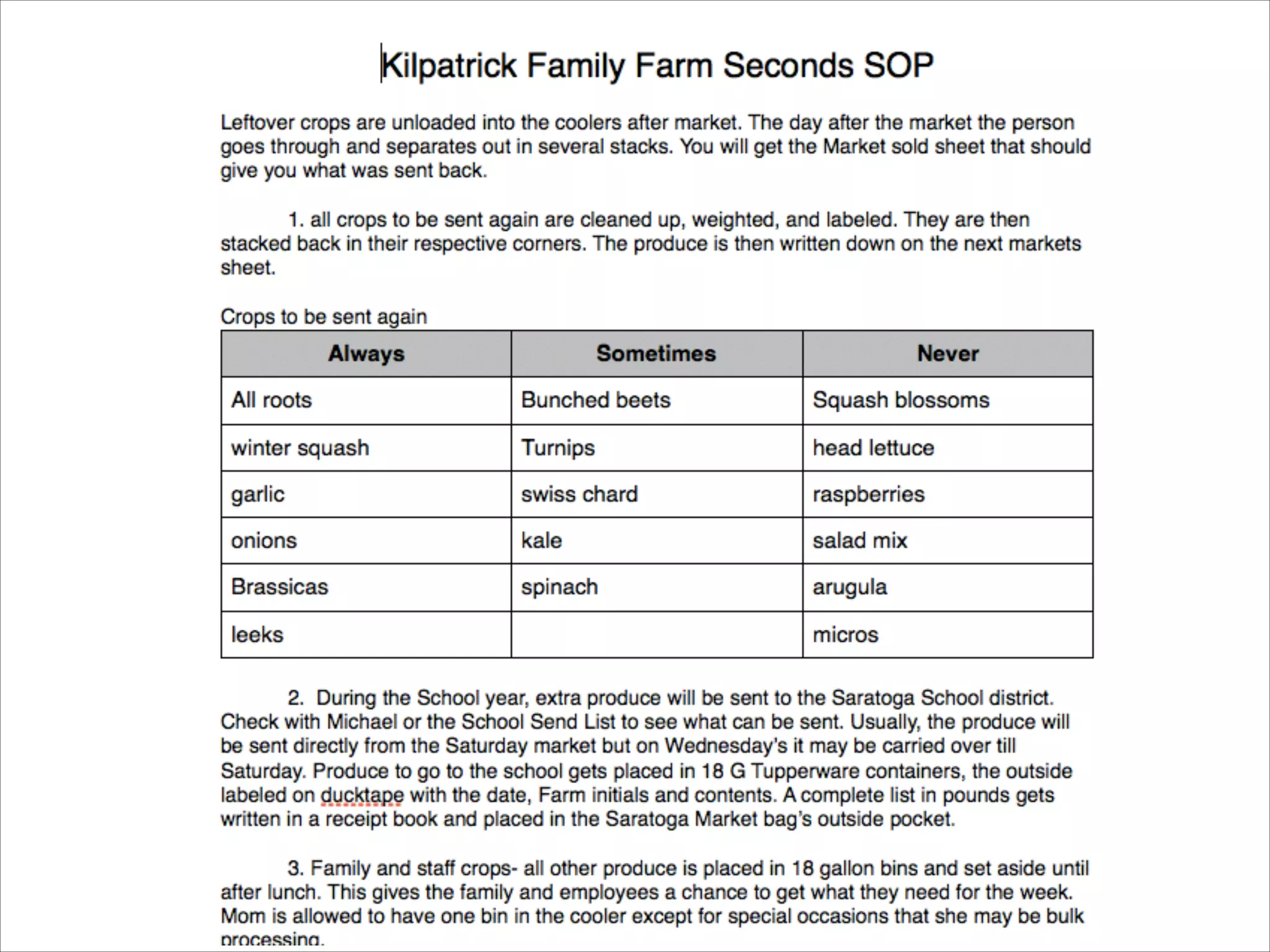 The document outlines the importance of standard operating procedures (SOPs) in farming to enhance efficiency, consistency, and safety among employees. It details steps for developing effective SOPs, including naming them, defining their scope, and involving staff in their creation to ensure buy-in and compliance. Additionally, it emphasizes the necessity of training and the need for routine monitoring and updates to these procedures for continuous improvement.