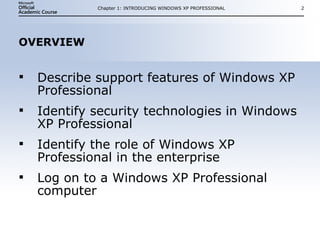 This document introduces Windows XP Professional by describing its architecture, user interface features, hardware support, security technologies, and role in enterprise networks. It is based on the Windows NT kernel and includes an intelligent user interface with Start menu, Taskbar and Desktop. It provides enhanced device driver support, CD/DVD recording, and network autoconfiguration. Security features include Windows Firewall, Security Center, Encrypting File System, and policy-based management. Windows XP can be used in workgroup or domain networks.
