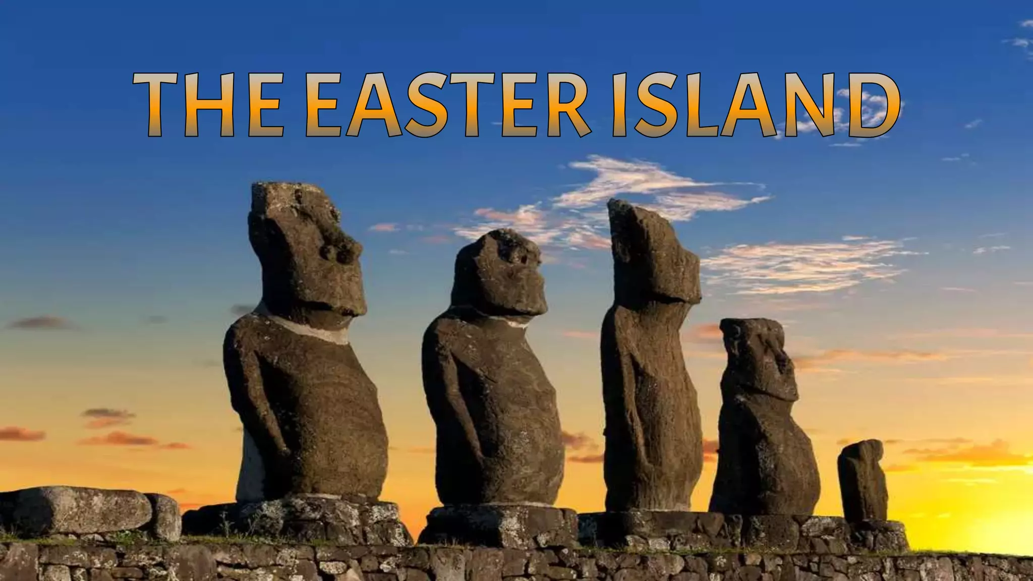 The Easter Island is famous for its large stone heads called moais that are found all around the island, believed to represent tribal ancestors. There are no trees on the island because the native people used logs to transport the heavy moai statues, and the moai actually have full bodies buried underground that are not visible.