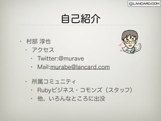 2012年9月22日、長崎(ランカードコム新オフィス)で開催されたRubyビジネス・コモンズのイベント サンプルプログラム http://www.lancard.com/blog/2012/09/21/mobiruby%E3%81%AE%E3%82%B5%E3%83%B3%E3%83%97%E3%83%AB%E4%BD%9C%E3%82%8A%E3%81%BE%E3%81%97%E3%81%9F%E5%8B%95%E7%94%BB%E4%BB%98/