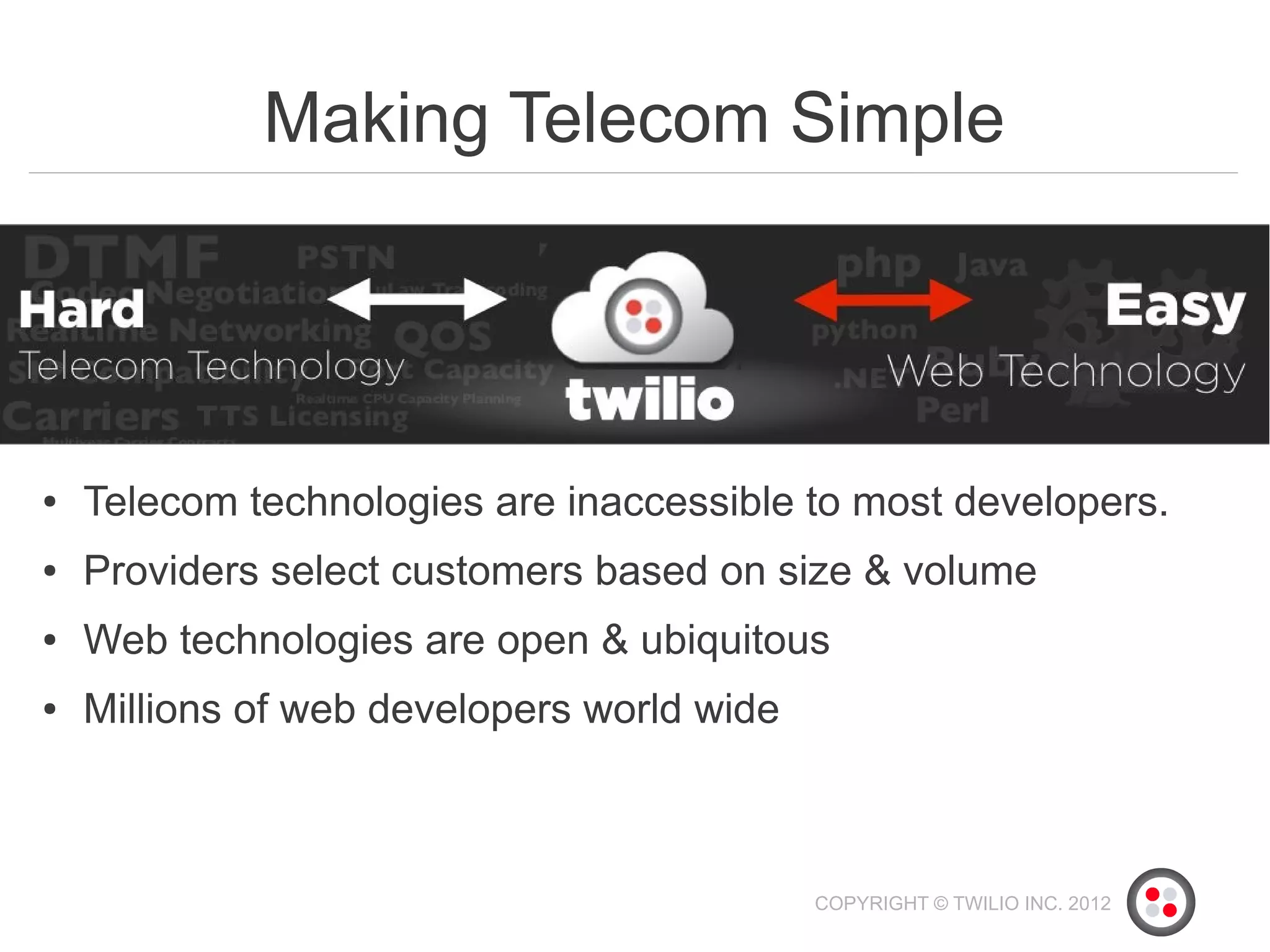 Twilio provides an API that allows developers to integrate voice and messaging capabilities into their applications. Their full-featured API can be accessed with just a few lines of code, allowing developers to send and receive phone calls and SMS messages programmatically. Twilio has built out infrastructure connecting to over 1,000 carrier networks worldwide, supporting use cases like call centers, conferencing, and gaming with real-time voice/text features.