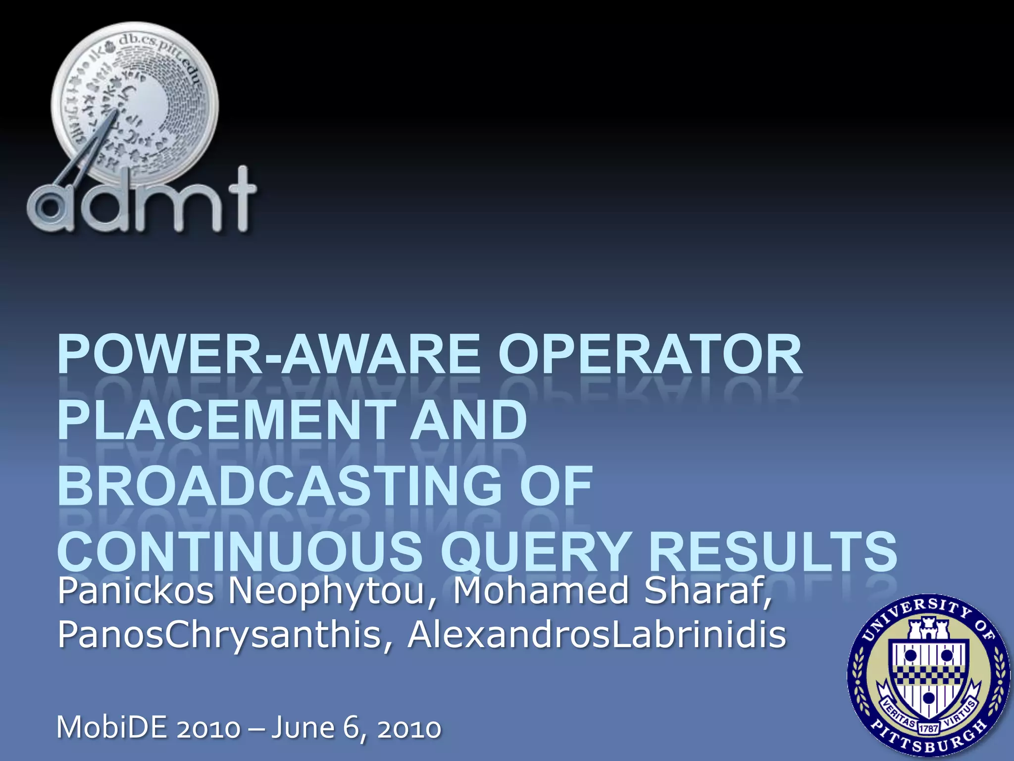 This document presents three algorithms for power-aware operator placement and broadcasting of continuous query results in a distributed stream processing system. The first two algorithms, MinDataCut and MinPowerCut, aim to minimize data transfer or processing power consumption but are not optimal. The third algorithm, BOSe, considers both tuning and processing energy costs to select operator placements. Experiments show BOSe improves energy efficiency by 53% over centralized processing. Future work includes supporting operator and query sharing to further optimize the energy-response time tradeoff.