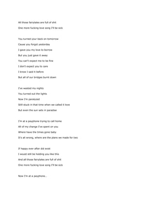 The song is about a man who is at a payphone trying to call home after spending all his money on his partner. He reflects on the plans they had made in the past for their future together and how things have now gone wrong between them, with all the bridges burned. He expresses regret over wasted nights and being stuck in the past when they called their relationship love.