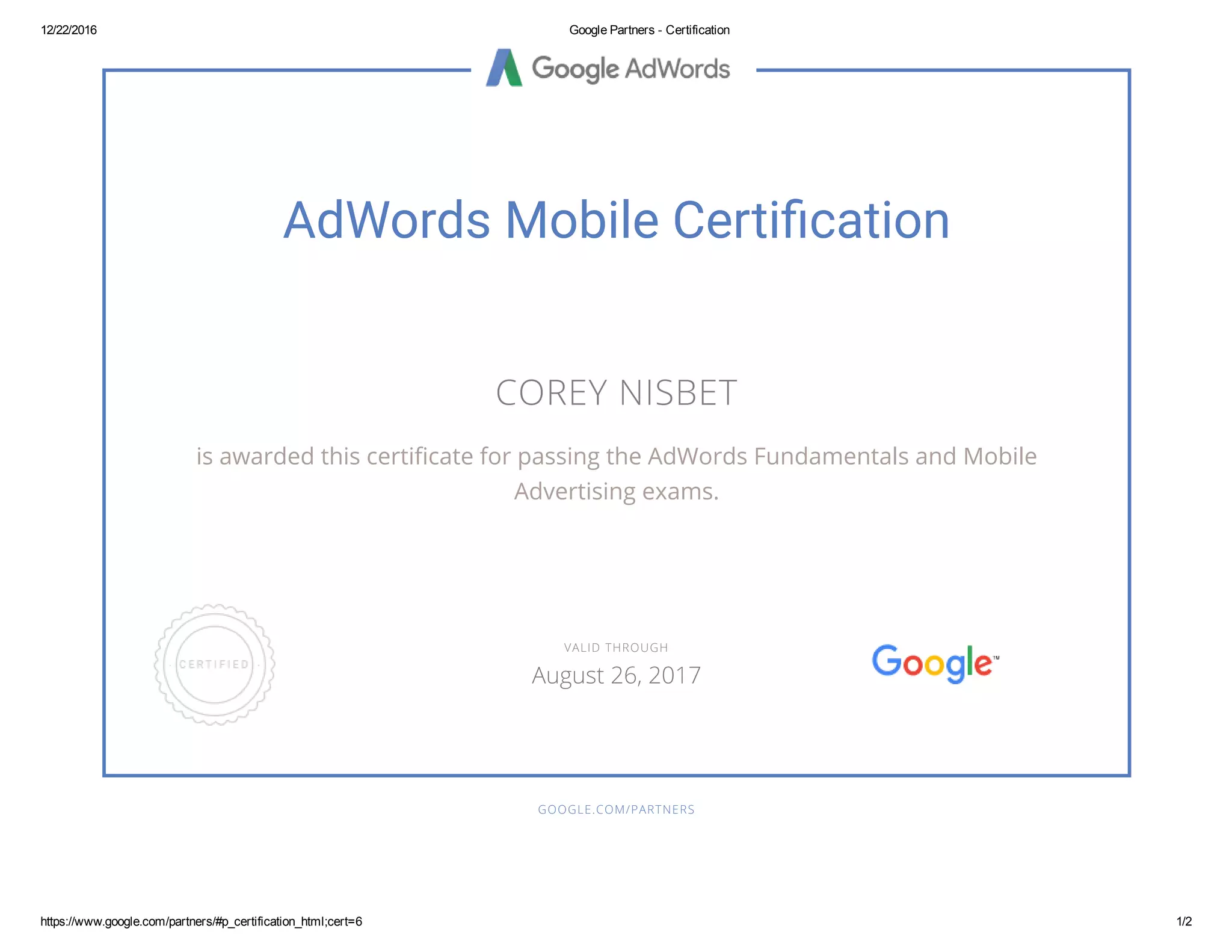 Corey Nisbet received a certificate from Google stating that he passed the AdWords Fundamentals and Mobile Advertising exams. The certificate awards Corey Nisbet with AdWords Mobile Certification and is valid through August 26, 2017 according to the document issued by Google.