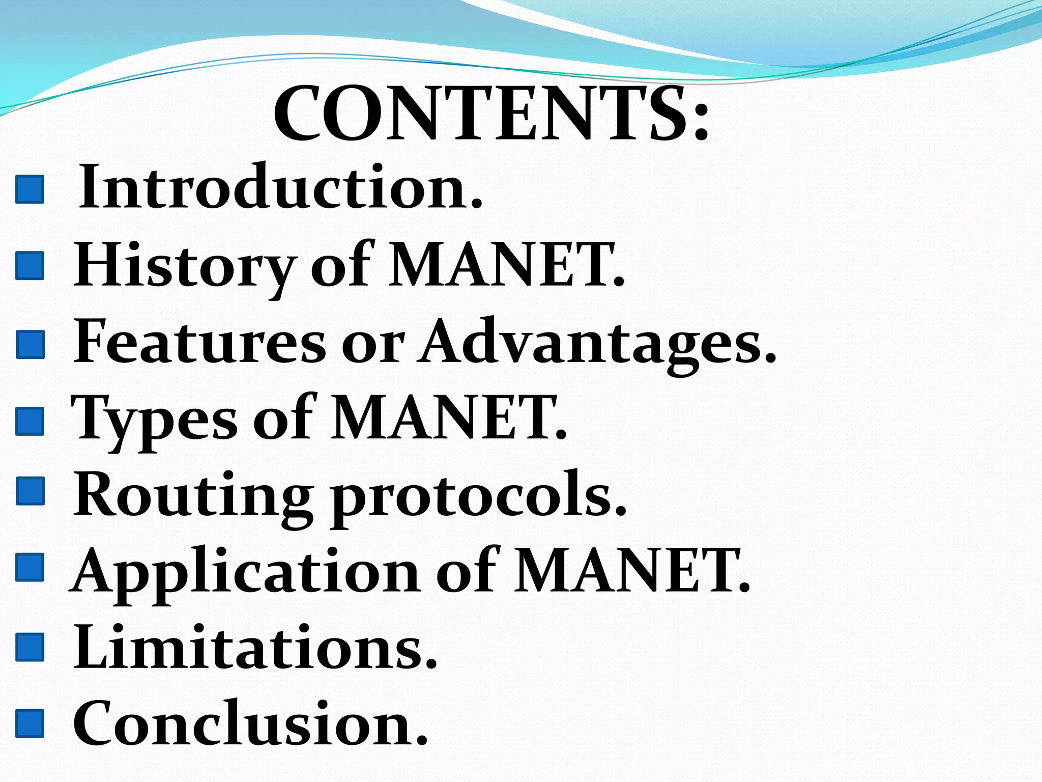 This document discusses mobile ad-hoc networks (MANETs). It defines MANETs as wireless infrastructureless networks where each node is willing to forward data for other nodes. The document outlines the history of MANETs including early packet radio networks. It describes key features like multi-hop routing and the ability for nodes to join or leave the network dynamically. Examples applications discussed include military, disaster recovery, and sensor networks. Finally, the document notes limitations of MANETs such as bandwidth constraints, energy limitations, and security issues.