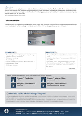 Analyzernx Mobile Edition provides mobile analytics solutions that integrate with a multichannel marketing strategy, offering over 200 metrics and KPIs. It utilizes various data collection methods to deliver detailed insights on mobile traffic, usability, and behavior, including mobile commerce measurement. The platform is designed to ensure data integrity and offers modular solutions tailored to specific business needs.
