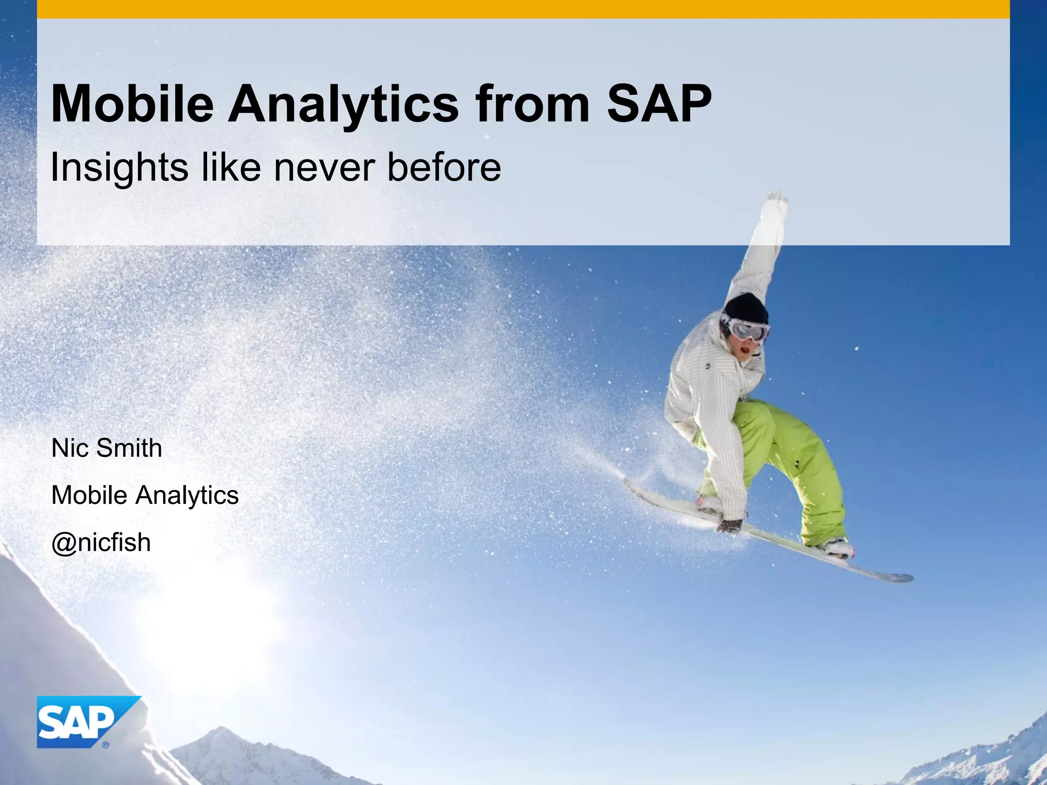 The document discusses trends in mobile analytics and business intelligence. Key points include the growing use of smartphones and tablets, expansion of data and decision points, and mobility becoming a priority for enterprises. It also covers SAP's focus on mobile BI, innovations like support for additional devices and platforms, and capabilities for reporting, dashboards, discovery and visualizing data on mobile.