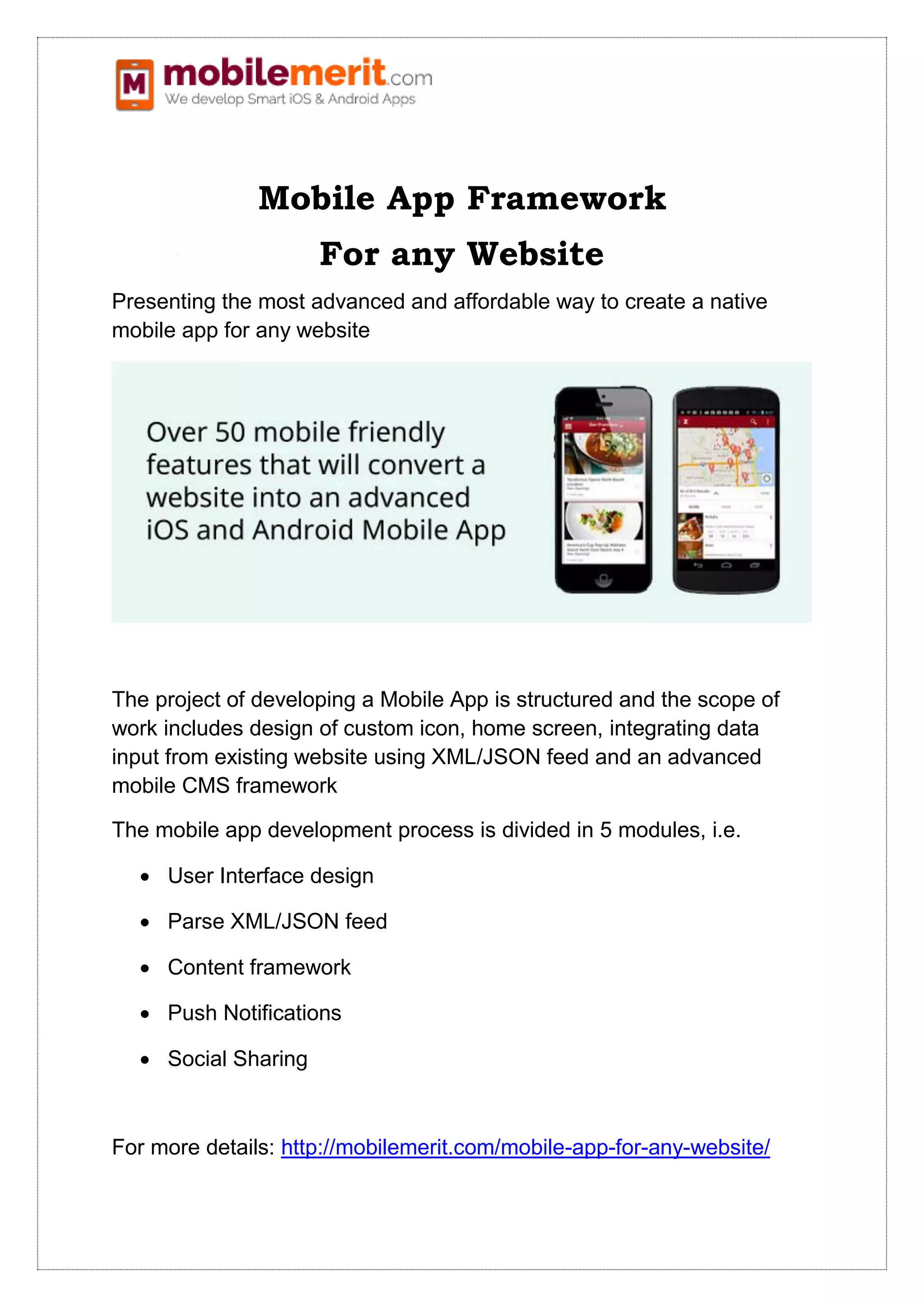 The document outlines a mobile app framework designed to create native mobile applications for any website, focusing on affordability and advanced features. Key features include user interface design, XML/JSON feed parsing, content management, push notifications, and social sharing capabilities. It highlights the framework's compatibility with WordPress, supports multimedia content, and includes functionalities like local database access and advertisement integration.