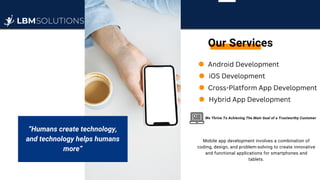 LBM Solutions is a leading mobile app development company that specializes in creating custom apps for iOS and Android. They have a skilled team of developers, designers, and project managers who deliver high-quality apps to drive business growth. Their services include mobile app development, Android development, iOS development, and more. They aim to achieve app success by transforming ideas into powerful, user-centric mobile applications.