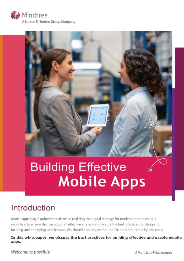 This whitepaper discusses best practices for developing effective and usable mobile apps, emphasizing the importance of user engagement and functionality. Key considerations include providing relevant features, ensuring intuitive design, and minimizing resource consumption to prevent uninstalls. The document also highlights the significance of regular updates, user privacy, and customizing notifications to enhance user experience.