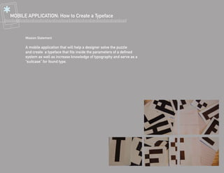 The document outlines a mobile application designed to help users, particularly students and designers, in creating typefaces through a structured learning process focused on typography basics and modular design. It details a three-step interactive approach that includes learning, creating, and refining typefaces using tools like Illustrator and Typetool, alongside user experiences and motivations. The app aims to promote creativity, knowledge retention, and hands-on engagement with type design while providing a platform for feedback and exploration.