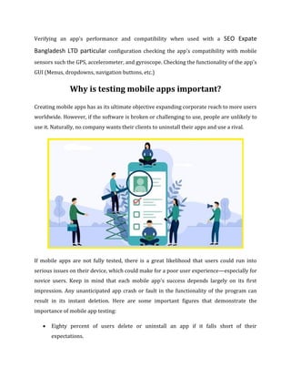 Mobile app testing evaluates an app's usability, functionality, and aesthetics on various devices to ensure a good user experience before release. Testing is crucial as 80% of users uninstall apps that do not meet their expectations, with factors like performance and space usage significantly impacting retention. It involves tests across different operating systems and device configurations, leveraging both manual and automated approaches to optimize app functionality for a broad audience.