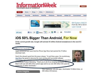 The document discusses the growing importance of mobile devices and apps for social media connections. It notes that there are now 4 times more mobile phone users than PC users, and that 80% of people in the US have a mobile phone. Push notifications through mobile apps allow for intimate communication with customers, with 97% viewing notifications compared to only 4% opening emails. The document encourages leveraging mobile apps for branding, customer engagement, and viral marketing to take advantage of the mobile world.