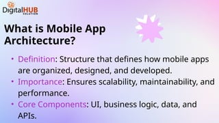 Mobile app architecture defines the organization and design of mobile applications to ensure scalability, maintainability, and performance. Key components include the UI, business logic, data, and APIs, with various architectures like native, hybrid, and web-based. Best practices involve modularization, separation of concerns, optimization for scalability, and security measures.