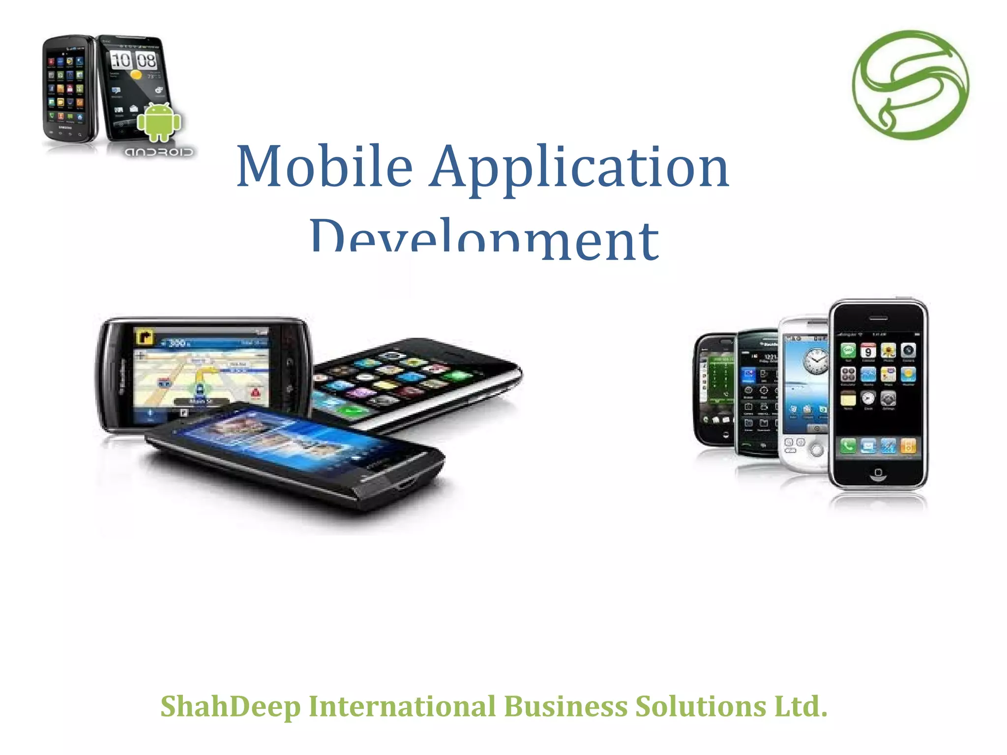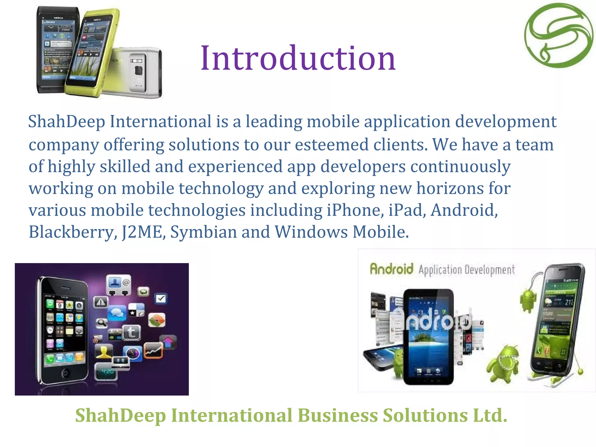 ShahDeep International is a leading mobile application development company that offers solutions for various mobile platforms. They have a team of experienced developers for platforms like iPhone, Android, Blackberry, Symbian and Windows Mobile. Their services include developing applications for these platforms using technologies like HTML, Java, .NET, and others. They ensure high quality and up to date application development along with testing and support for distribution.