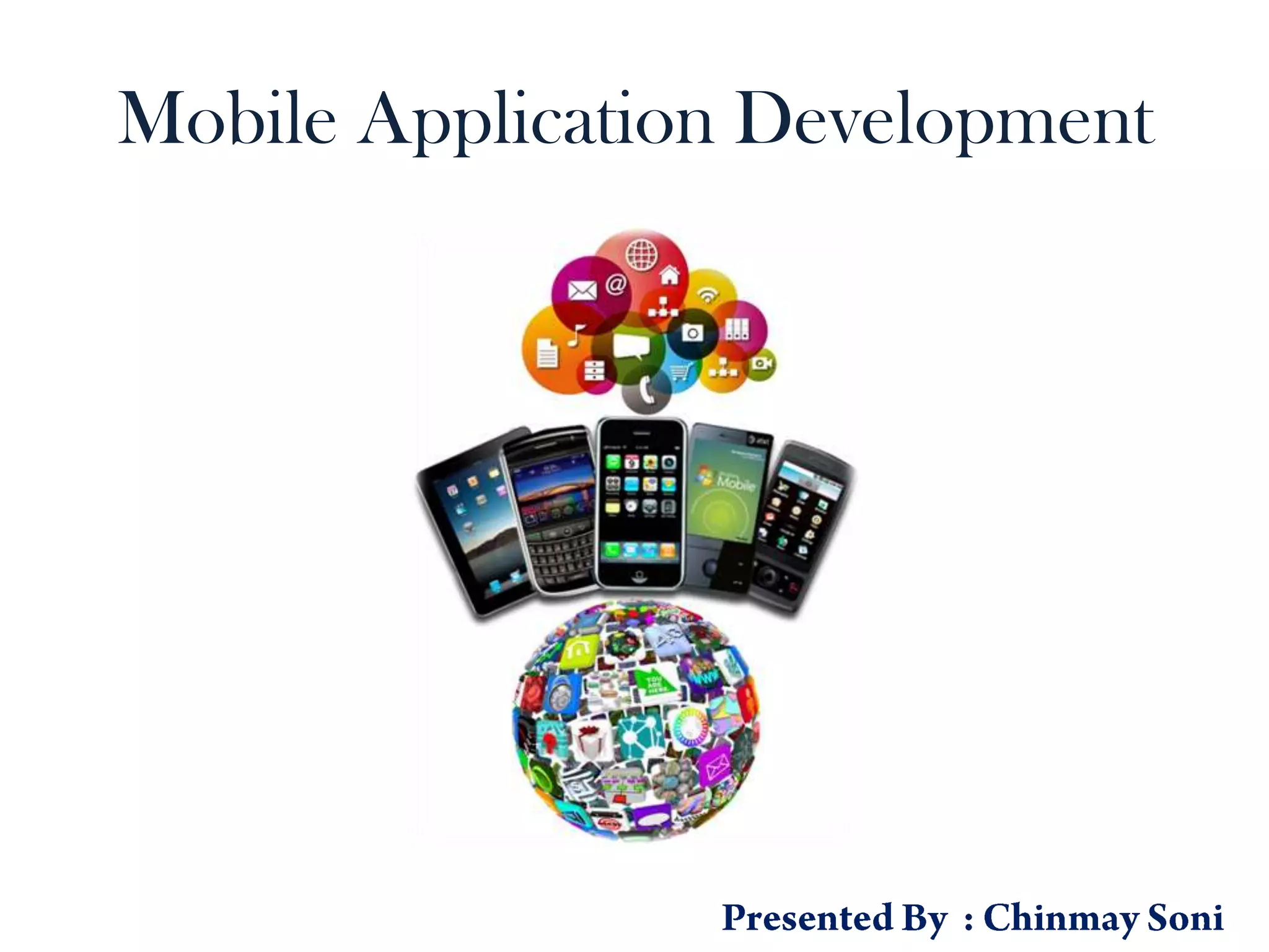 This document provides an overview of mobile application development. It discusses the different types of mobile apps including native apps, hybrid apps, and mobile web apps. It also outlines the typical phases of mobile app development including discovery, design, development and testing, and maintenance. Finally, it lists some commonly used tools and frameworks for mobile app development such as PhoneGap, jQuery Mobile, and Android and iOS SDKs.