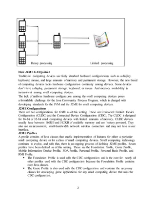 J2ME was created to allow Java applications to run on mobile and small computing devices with limited hardware capabilities. It consists of configurations like CLDC and profiles like MIDP that allow Java applications to run on devices with as little as 160KB of memory. J2ME applications are modified versions of desktop Java applications since mobile devices have fewer resources. Wireless networks use radio transmissions over cellular networks to connect mobile devices. Digital cellular networks now allow both voice and data to be transmitted using techniques like CDMA and TDMA. This enables the development of mobile applications running on Java platforms like J2ME.