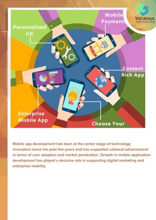 Mobile application development has greatly advanced in recent years, driving digital marketing and enterprise mobility. In 2015, personalization will be a major trend, with apps offering personalized content and services based on individual user data. Mobile payments are also expected to grow significantly with more secure payment solutions being integrated into mobile apps. Hybrid app development combining HTML5 and native platforms is becoming popular as it allows for faster development across platforms while maintaining a good user experience. Overall, mobile apps in 2015 will see improvements in design, performance, functionality, and content due to advancing hardware capabilities.