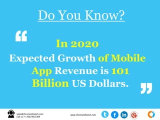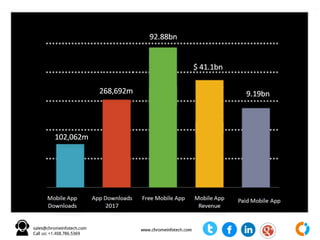 The document discusses the mobile application development process and highlights the expected growth of mobile app revenue, projected to reach over $101 billion by 2020. It details various benefits of enterprise mobile apps, such as enhancing employee collaboration and knowledge sharing while also allowing offline access to data. The development process is outlined in stages, from initiation to final release, emphasizing the importance of testing and customer support.