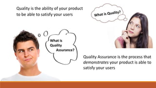 The document discusses the importance of quality assurance (QA) and quality control (QC) in mobile application development, emphasizing that QA ensures products meet user satisfaction while QC focuses on testing and validating the product's quality. It highlights various types of mobile testing, including hardware and software tests, as well as the different categories of mobile applications such as native, mobile web, and hybrid applications. The document also outlines mobile application testing strategies, challenges, and considerations for testing on various devices and networks.