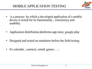 - Challenges of mobile app testing like different devices, platforms, and input methods.