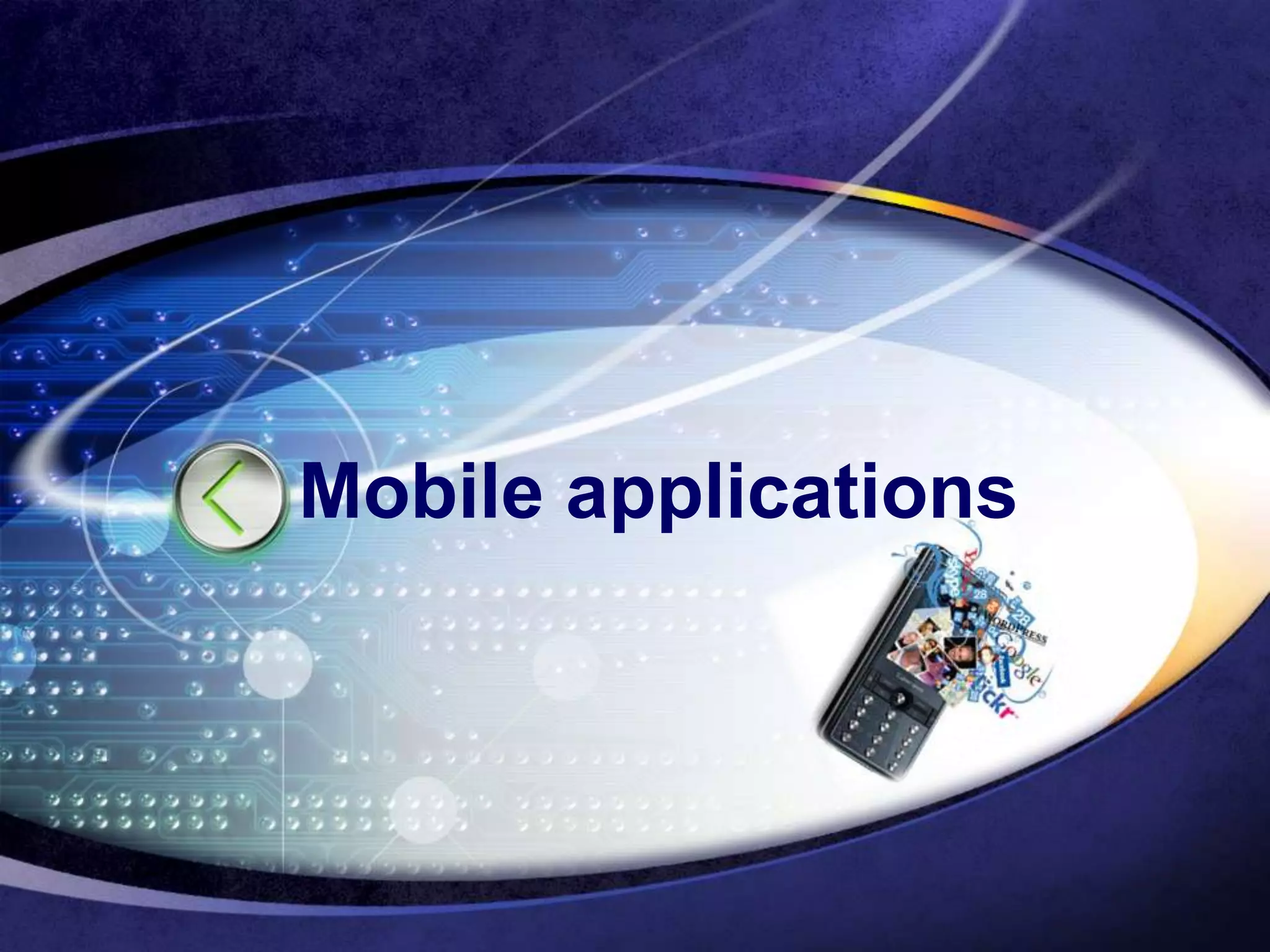 The document provides an overview of mobile applications and the Wireless Application Protocol (WAP). It discusses the growth of mobile phones and applications. WAP allows access to services like financial information, tickets, bills, and news from mobile devices by optimizing for bandwidth constraints. The WAP architecture includes a WAP gateway and web server. Key WAP protocols include WSP, WTP, WTLS, and WDP. WAP handles device and network limits through techniques like binary encoding, asynchronous requests, and minimizing bandwidth usage. The future of WAP depends on consumer adoption and whether new technologies require different infrastructures.