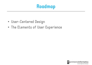 The document discusses user-centered design (UCD), which is a design philosophy focusing on the end user's needs, wants, and limitations during the design process to ensure high usability. It outlines various stages of the UCD process including user analysis, testing, and the creation of personas, as well as the key elements that contribute to an effective user experience. Additionally, it explores the importance of prototyping and the different types of wireframes used to visualize and test design concepts.
