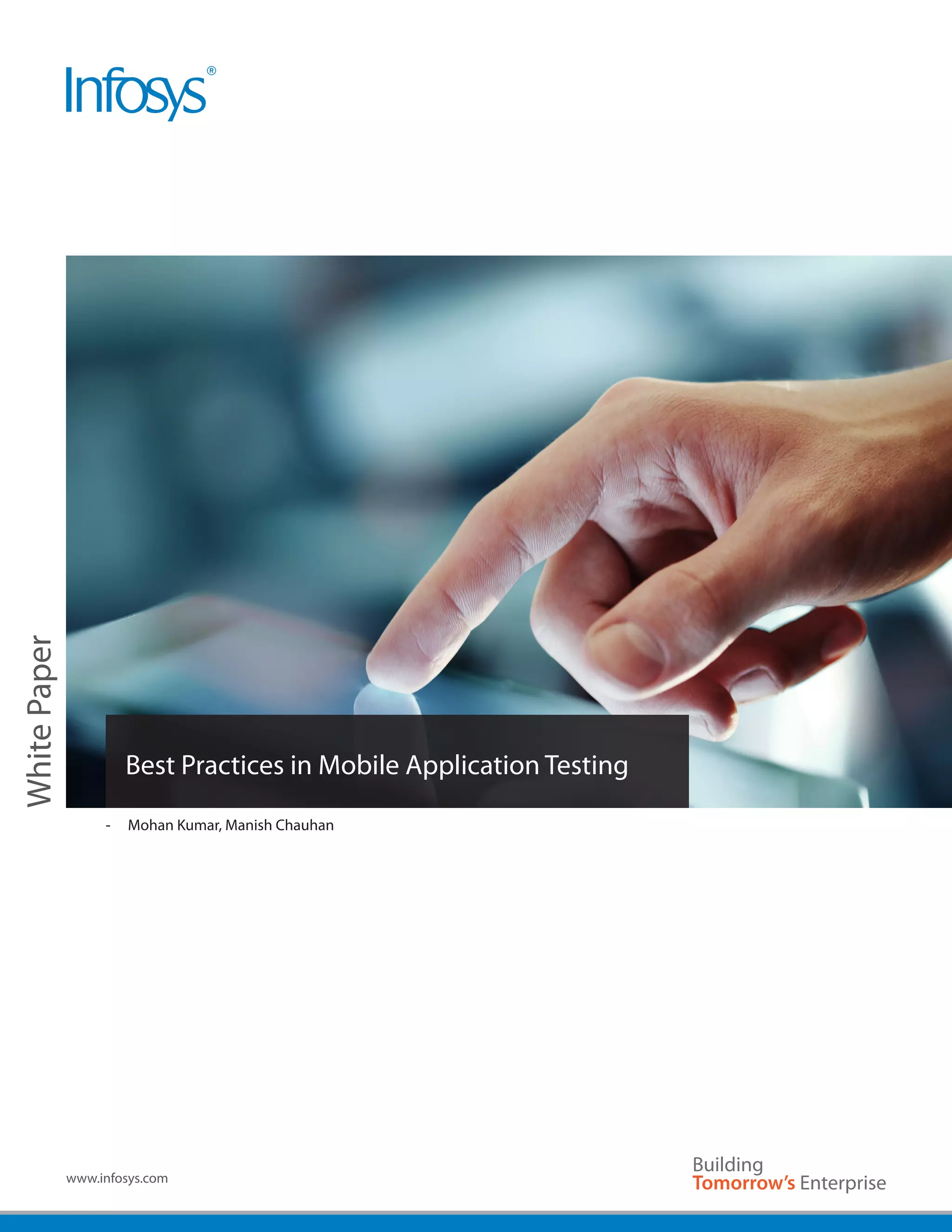 This document discusses best practices for mobile application testing. It identifies several challenges of mobile testing, including device variation, lack of testing tools, need for skilled automation specialists, and cloud computing issues. It recommends a testing strategy that utilizes emulators, mobile cloud solutions with remote devices, and some real device testing. It also recommends automating tests to reduce manual work. The document outlines various types of mobile application tests, including usability, compatibility, interface, services, performance, security, and more. It stresses the importance of addressing the challenges of mobile testing to successfully deliver high quality mobile apps.