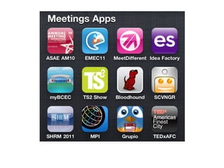 This document provides an overview of mobile event apps and their benefits. It discusses the advantages of native apps versus mobile websites and important features to include. Finally, it outlines next steps for attendees to build their own basic mobile event app using the AppBaker platform.