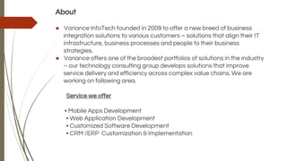 Variance Infotech, founded in 2009, provides business integration solutions including mobile app development, web applications, and customized software. Their portfolio features various applications such as beauty service management, CRM management, and personal expense tracking, all with unique functionalities tailored for different industries. The company aims to enhance service delivery and efficiency in complex value chains through innovative technology solutions.