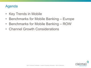 The document discusses key trends in mobile banking and benchmarks for innovation in Europe and the rest of the world (ROW). It covers how some banks have made mobile a standalone channel or distribution channel, focusing on account access, payments, loans, and driving broader digital strategies. Specific examples highlighted include La Caixa making mobile a full channel in Europe, Akbank distributing loans via mobile banners, and Wells Fargo using mobile as a standalone channel in the ROW. The document analyzes how mobile banking is evolving from early notification services to a critical part of digital transformation.