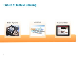 The document discusses trends in mobile banking and financial applications. It describes how banks are developing their own mobile apps in response to growing iPhone banking usage. Customers want apps that provide features like bill pay, expense tracking, and money transfer beyond just mobile websites. Third party apps are fulfilling some of these needs. The document recommends banks provide inclusive information across channels and consider social media, promotions, peer-to-peer payments, NFC technologies, and mobile check deposit features.