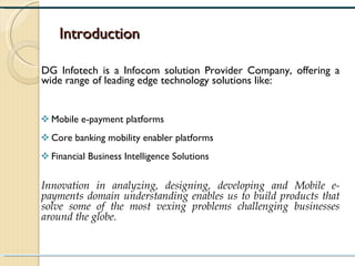 The document discusses DG Infotech's mobile banking and remittance services. It provides secure and scalable remittance services using mobile interfaces that allow sending money from any mobile device. Funds can be sent internationally through a process that deducts money directly from the sender's bank account and deposits it instantly into the recipient's account without any cash handling. This allows low-cost and reliable money transfers with status notifications to both sender and recipient.