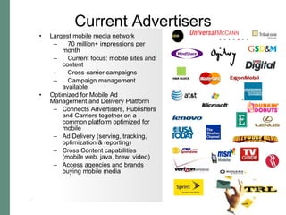 The Right List offers an exciting mobile advertising platform that can send broadcast messages and banner ads to over 70 million mobile subscribers monthly. It provides campaign management services and optimizes delivery across mobile web, apps, video and other formats. Usage data shows 10% of mobile users browse content monthly on their phones. The Right List network reaches educated, affluent users and examples of successful campaigns for Dunkin Donuts and Nextel are described.