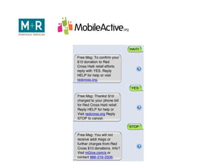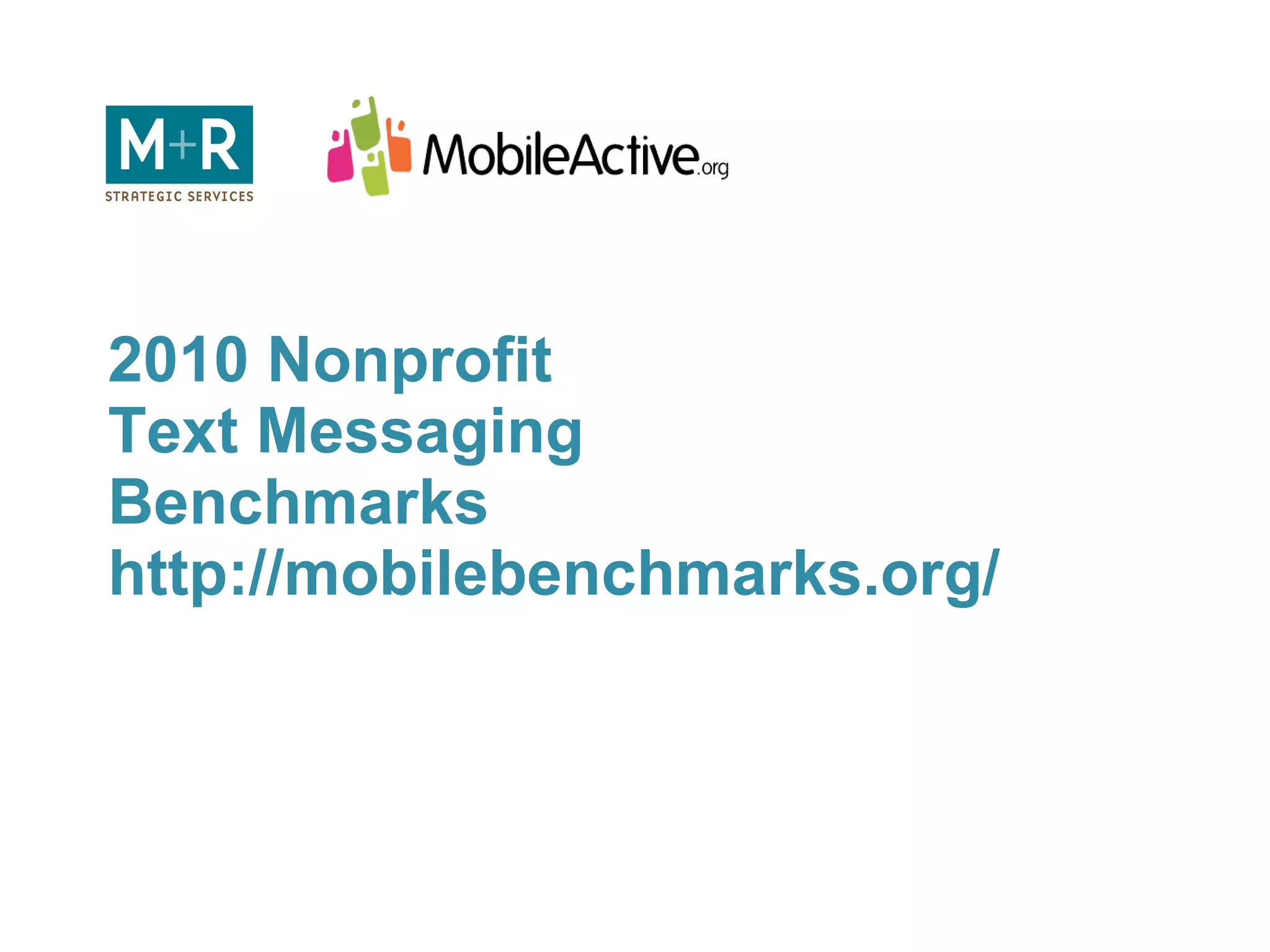 This document summarizes benchmarks for nonprofit organizations using text messaging. It finds that the average list growth rate for mobile numbers is 49.5% annually, while the average churn rate is 30.7%. The average unsubscribe rate for text messages is 0.69%. Fundraising and advocacy text messages had higher response rates than emails, with advocacy texts seeing a 4.7% response rate. The document outlines best practices for different types of outbound text messages and notes that 73-87% of text subscribers could be matched to email lists.
