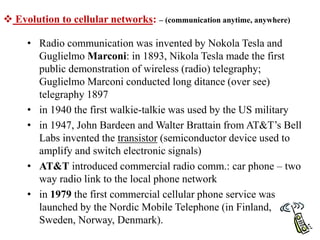 The document provides a comprehensive overview of the history and evolution of radio communication, highlighting key advancements from Nikola Tesla's and Guglielmo Marconi's early demonstrations to the development of mobile cellular networks. It explains the generational advancements in cellular technology (1G to 4G), the concept of frequency reuse, and the essential components and processes involved in mobile communications, such as call setup, handoffs, and channel assignment strategies. Additionally, it discusses various types of cells and interference management within cellular systems.