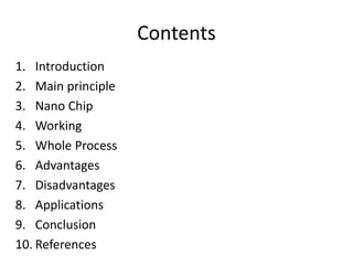 This document discusses a new technology for generating electricity from body movements using zinc oxide nanowires. The nanowires produce electricity when flexed or strained. Each chip contains millions of nanowires that can generate enough power for small electronics. When the heart beats or the body moves, the vibrations cause the nanowires in a chip placed on the chest to flex, generating electricity that can be stored and used to charge devices like phones or iPods without needing external batteries. The technology has applications in pacemakers and personal electronics and could eliminate the need for batteries by powering devices from human motion.