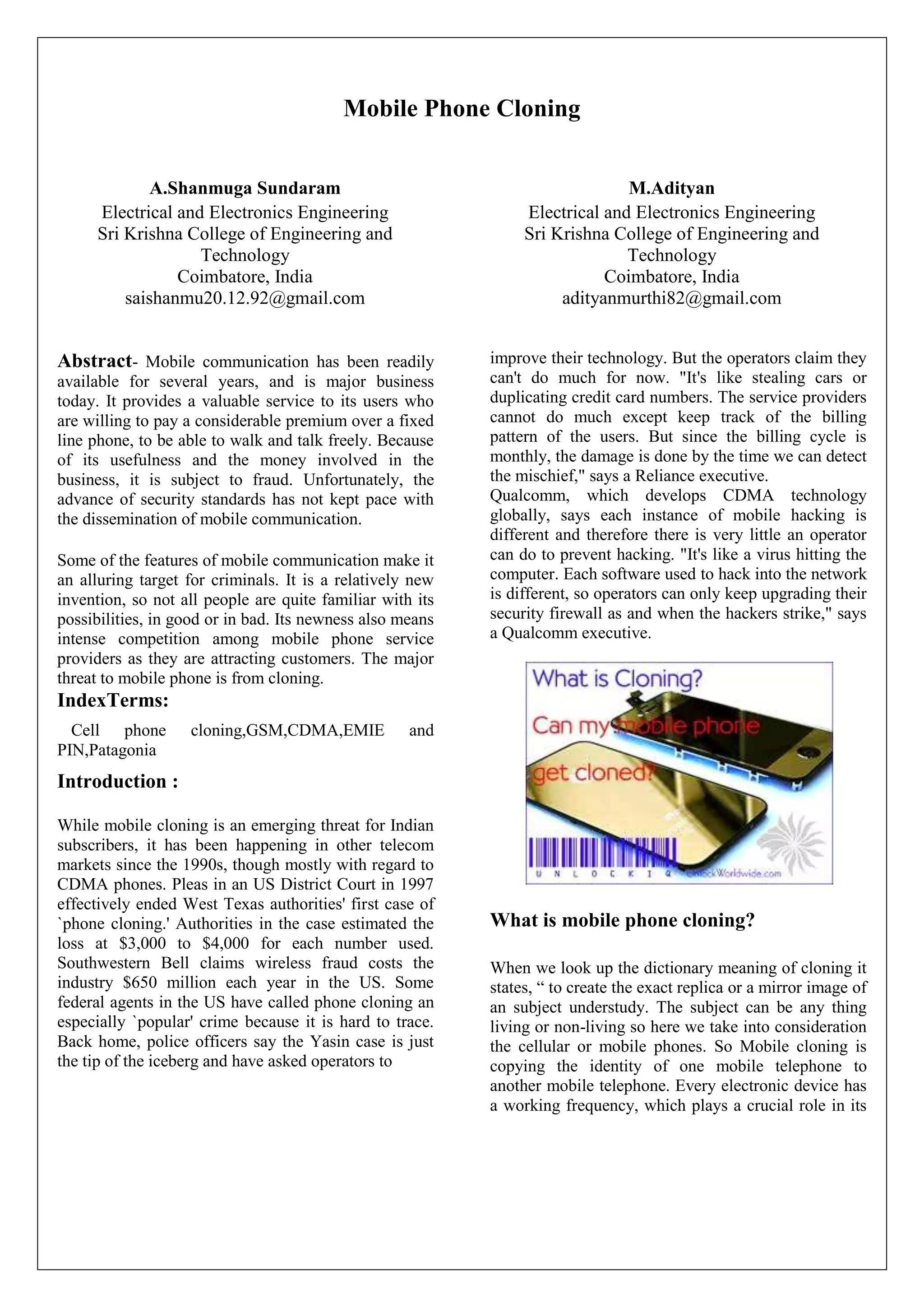 Mobile phone cloning involves copying the identity of one mobile phone to another without authorization. This is done by obtaining the phone's electronic serial number (ESN) and mobile identification number (MIN) and programming them into another phone. Various software programs and devices can be used to clone phones for both GSM and CDMA networks. Cloning impacts the mobile phone industry through lost revenue from fraudulent calls billed to legitimate customers. Methods to detect cloning include duplicate detection if multiple phones have the same identity in different locations simultaneously, and checking unique radio frequency fingerprints of phones. Prevention involves securing phone identifiers and numbers, using PIN codes, and service providers disconnecting cloned phones from the network.