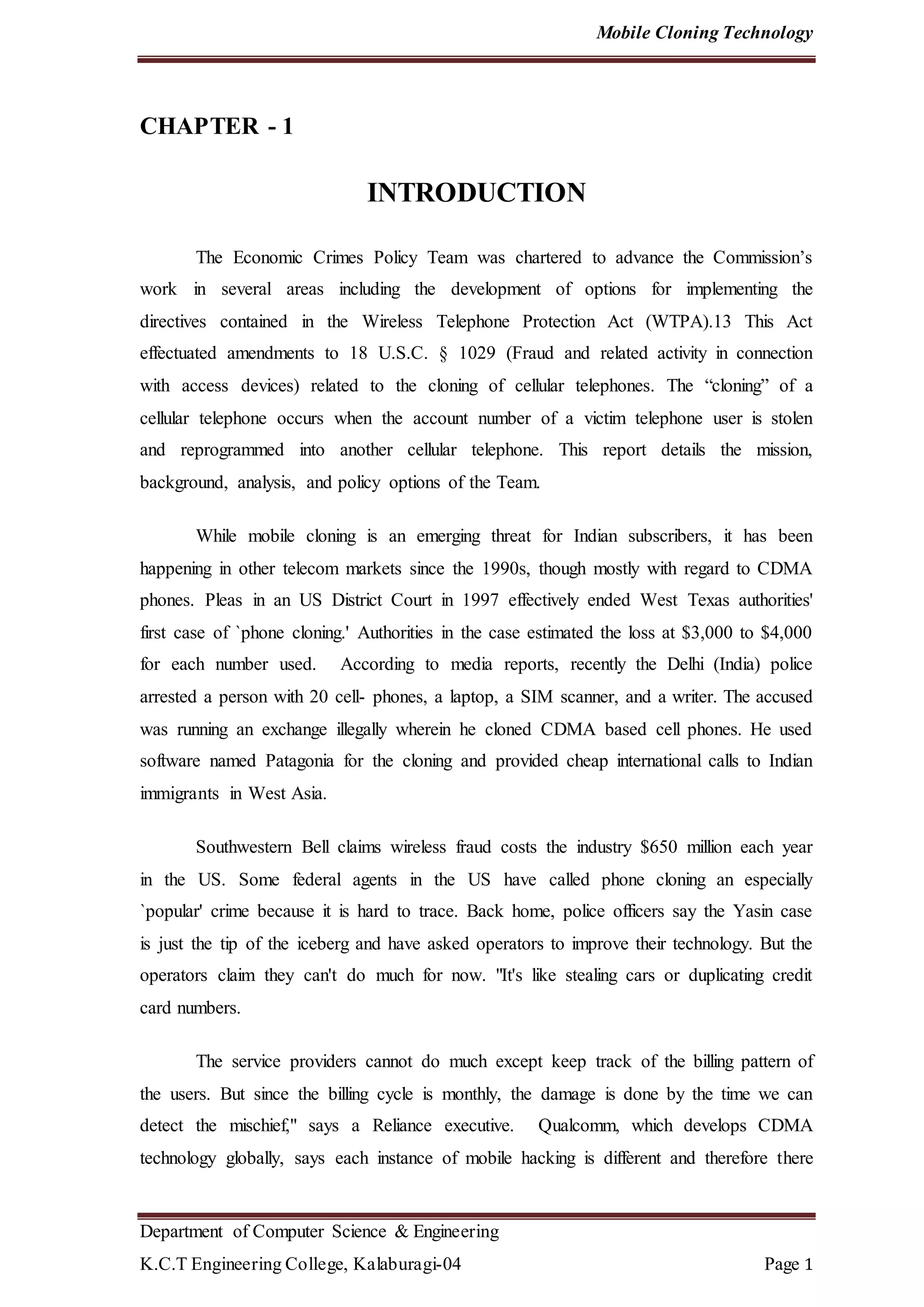 Mobile phone cloning involves illegally reprogramming the identifying information from one phone into another. This allows calls made on the cloned phone to be billed to the legitimate subscriber. While mobile cloning has been an issue since the 1990s in other markets, it is an emerging threat in India. Cloning can be done by using software to modify the phone's ESN or MIN and programs these identifiers into another phone. Service providers find it difficult to detect cloning right away due to monthly billing cycles.