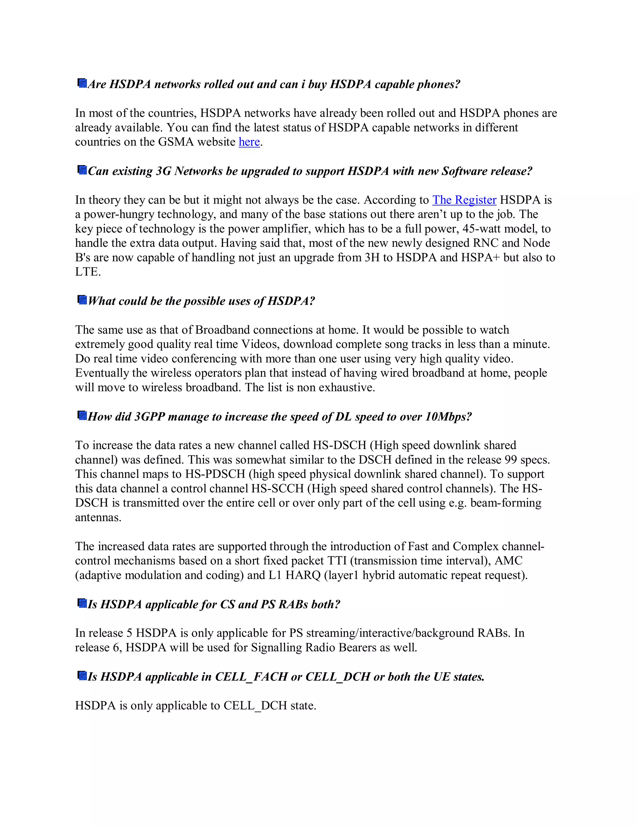 HSDPA (High Speed Downlink Packet Access) is an enhancement to 3G technology that increases download speeds from 384 Kbps to 10 Mbps. HSDPA works by improving spectral efficiency and introducing fast channel control mechanisms. It uses a high speed downlink shared channel and adaptive modulation and coding to boost speeds. While part of 3G, HSDPA is also referred to as 3.5G. HSUPA provides similar enhancements for the uplink. Networks have rolled out HSDPA widely and compatible phones are available. References on HSDPA specifications and technologies are provided.