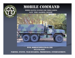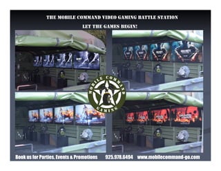 This document advertises a mobile video gaming battle station business called Mobile Command that can be booked for parties, events, team building activities, and promotions. Mobile Command provides a mobile gaming unit that allows groups to play video games together for entertainment purposes. Contact information is provided to book Mobile Command.