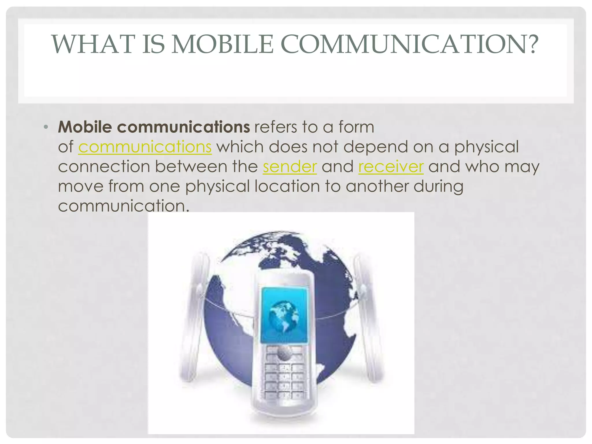 The document outlines the history and evolution of mobile communication, detailing significant milestones from the late 19th century to the introduction of 4G technology. It compares different mobile communication technologies such as GSM, CDMA, TDMA, and FDMA, and discusses their characteristics, including security concerns and data transfer rates. Additionally, it lists the largest mobile phone and telecommunications equipment vendors in the world.