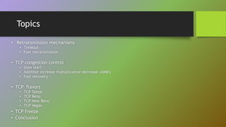 This document discusses various TCP flavors and congestion control mechanisms. It begins with an overview of TCP functions like connection orientation, flow control, retransmission, and congestion control. It then covers retransmission mechanisms including timeout-based retransmission and fast retransmission. TCP congestion control mechanisms like slow start and additive increase multiplicative decrease are explained. The document summarizes TCP Tahoe, Reno, New Reno, Vegas, and Freeze flavors and how they implement congestion control algorithms. It provides state diagrams and examples to illustrate the differences between these TCP variants.