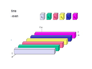 Multiplexing allows for the multiple use of a shared medium by separating signals using space, time, frequency, or code. Examples of multiplexing techniques include frequency division multiplexing, which separates the spectrum into frequency bands; time division multiplexing, which allocates the full spectrum to each channel for short time periods; and code division multiplexing, which assigns unique codes to each channel to share the full spectrum simultaneously.